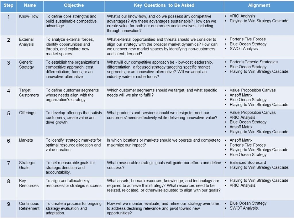 A key advantage of this methodology lies in its dynamic nature. It is not a static blueprint but a living framework, enabling strategists to revisit and refine steps based on new insights, evolving market conditions, or execution challenges. This methodology guides strategists through a clear progression of questions that drive concrete choices rather than abstract analysis. Furthermore, the questions are designed to stimulate creative thinking, encouraging innovation and the development of unique value propositions.